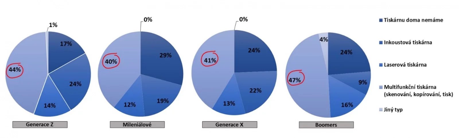 Nejvyšší podíl „vlastníků“ domácích tiskáren je v generaci Z: ve věkové skupině do 27 let má doma tiskárnu 83 % dotazovaných. Poměrně vyrovnané je zastoupení „vlastníků“ tiskáren v dalších věkových skupinách – mezi mileniály (narození 1981–1996) je to 71 %, v generaci X (narození 1965–1980) 76 % a v generaci Boomers (narození do roku 1964) 76 %.