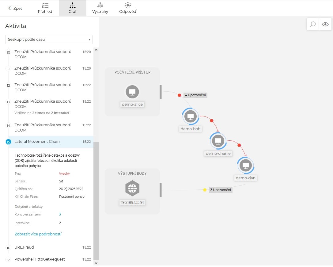 Na první pohled je vidět, z jakého vektoru útok přišel, kolik a které koncové body byly zasaženy, jaké byly postupné kroky útočníka, a adresa serveru útočníka, jenž využil pro exfiltraci dat. V přehledu jsou vidět nejdůležitější kroky útočníka (původní přístup byl ze stanice demo-alice, pak došlo k laterálnímu pohybu skrz stroje demo-bob, demo-charlie až na stroj demo-dan a ze stroje demo-dan byla provedena exfiltrace dat na IP adresu 195.189.155.91). Bezpečnostní incident je u právě probíhajícího útoku aktualizován v reálném čase a doplňován o každý další krok, který útočník dělá. Bezpečnostní tým může pochopitelně útočníka „odstřihnout“ – zablokovat přístup do sítě strojům, které k útoku zneužívá, a připojit se na příkazový řádek těchto strojů (powershell, bash, zshell), zablokovat uživatelský účet, jenž zneužívá apod., a to přímo z ovládací konzole Bitdefender GravityZone – tyto akce jsou bezpečnostnímu týmu přímo nabídnuty a na jedno kliknutí mohou být provedeny.