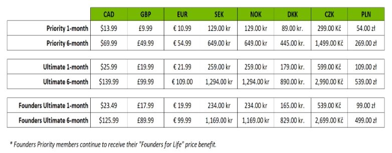 Za základní členství Priority si češi zaplatí 299 Kč měsíčně, za půlroční předplatné 1499 Kč. Předplatné Ultimate bude nově stát 599 Kč měsíčně a 2990 Kč půlročně. Nové ceny začnou platit od 1. listopadu letošního roku. Pokud si však do tohoto data stihnete pořídit jakékoliv z výše zmíněných předplatných nebo si už stávající předplatné prodloužíte, zůstanete ještě u stávajících cen. Výjimkou jsou pouze majitelé „Founders Ultimate“ předplatných, pro které se ceny nemění.