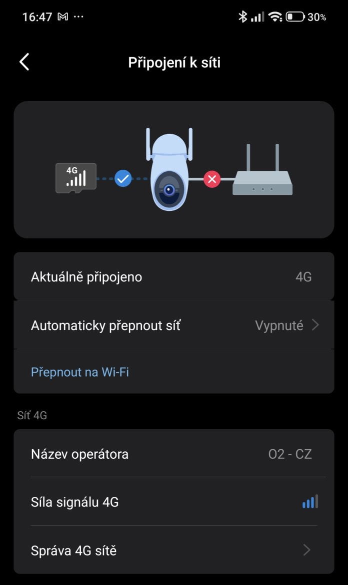 V opačném případě je třeba počítat že přenos obrazu vyžaduje celkem slušný objem dat a karta by měla mít odpovídající limit. Dle údajů výrobce 1 hodina živého náhledu ve 4K 8MP využije asi 653 MB dat bez cloudového úložiště. S ním pak 737 MB. 1 hodina živého náhledu v 720p využije asi 206 MB bez cloudového úložiště a 287 MB s cloudovým úložištěm. Rozhodně se tedy vyplatí mít kartu s minimálně 5 GB dat, ale raději více. V aplikaci je možné sledovat sílu signálu, čerpání datového tarifu a další podrobnosti.