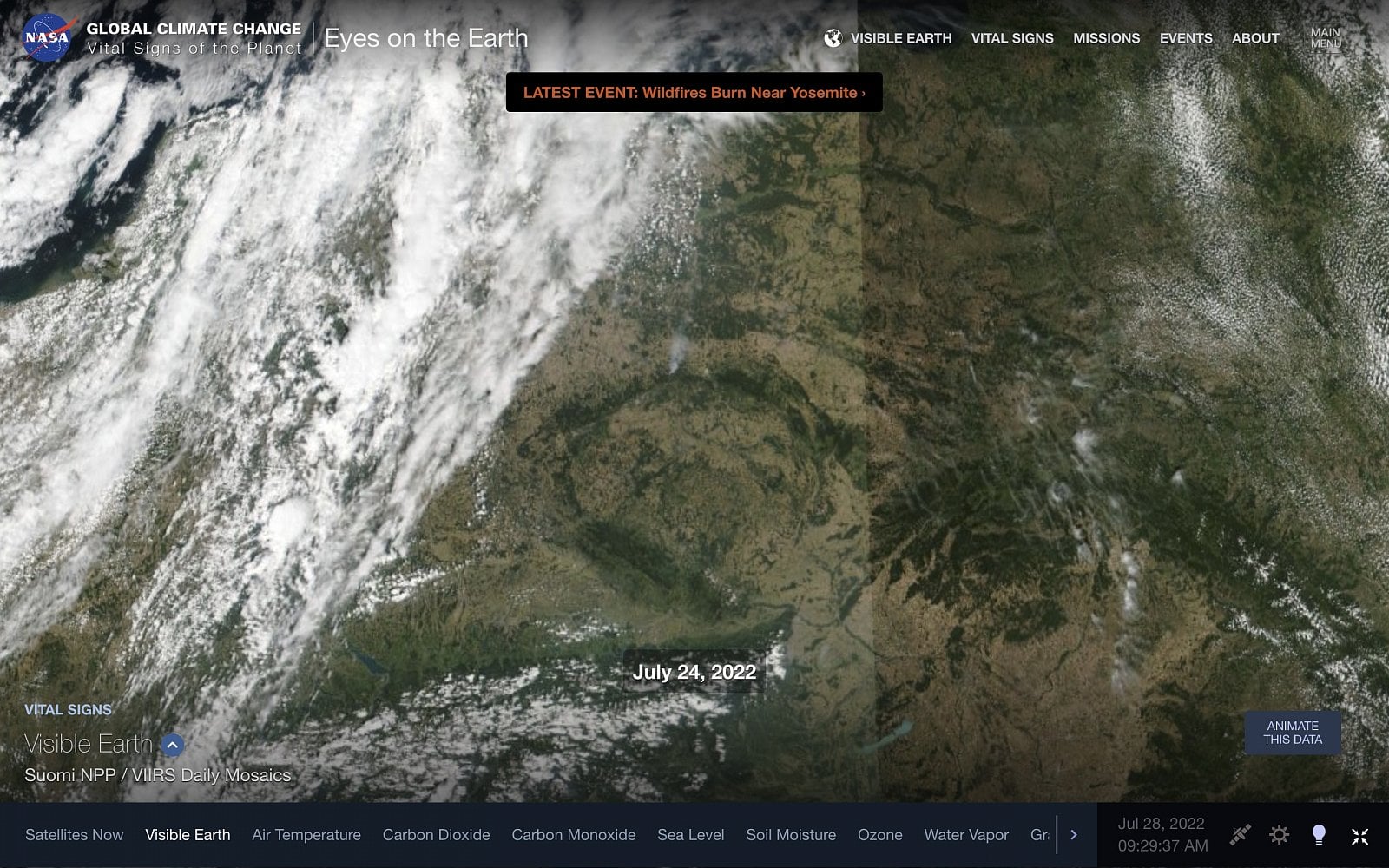 Další web, který spadá pod americkou Nasa. Web poskytuje data z mnoha družic, v aplikaci je ostatně i vidíte. Můžete si zazoomovat a zvolit i údaje, které chcete zobrazit. Na 3D glóbusu se dalo najít tento týden víc ničivých požárů.