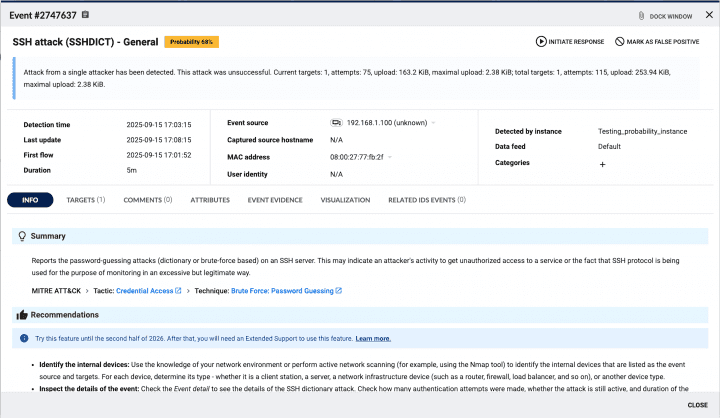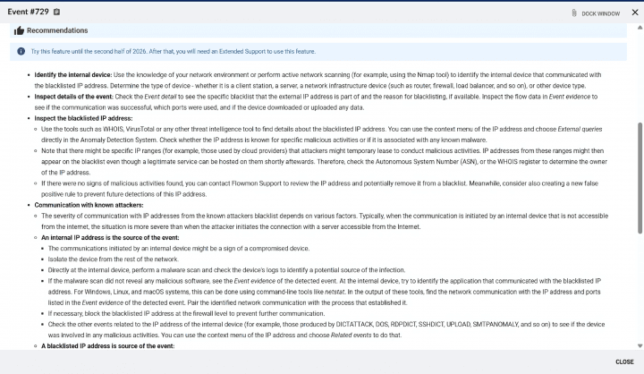 - Doporučení na úrovni expertů: Flowmon ADS nyní přináší kontextové, krok-za-krokem vedená doporučení, které zjednodušují řešení incidentů. Tato doporučení pomáhají IT týmům přijmout rozhodné kroky, jako například izolovat zařízení či upravovat bezpečnostní zásady. A to bez nutnosti hlubokých znalostí v oblasti kybernetické bezpečnosti.